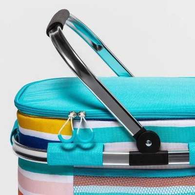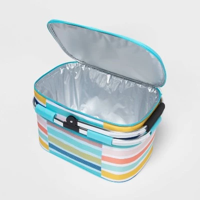 From pool parties, picnics and concerts to camping, fishing, beach excursions and more, carry your favorite beverages with you and enjoy them chilled with this Striped Picnic Cooler from Sun Squad™. This picnic cooler features a main zipper compartment to hold up to 36 beverage cans, along with an insulated design that ensures the contents stay cool. Showcasing a classic rectangular silhouette with an open-top design for easily grabbing your drink, this portable cooler is designed with a collapsible tote handle for effortless carrying, while the foldable design makes it easy to store when not in use. Adorned with multicolor stripes, it’s sure to add a pop of color to your outdoors and travels.