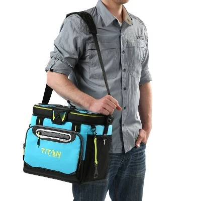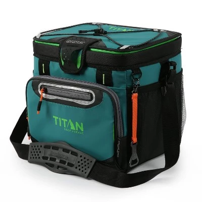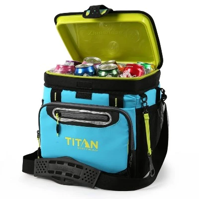The wipe clean, coated exterior of the Titan Deep Freeze® Zipperless Cooler is water and stain repellent, has Microban® built into it and features an insulated front compartment as well as an adjustable Backsaver® shoulder strap with anti-slip shoulder pad that centers load weight to help make the cooler easier to carry.