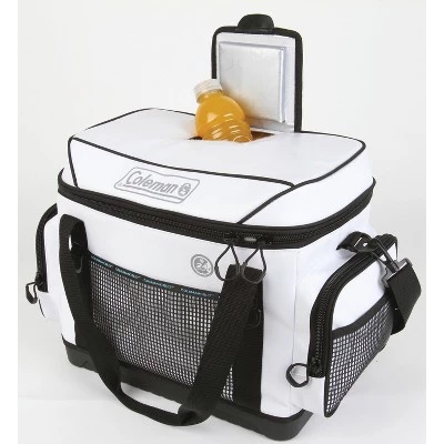 Keep your food and drinks cold for an extended time on the water when you bring them in the Coleman 42-Can Soft-Sided Marine Cooler Bag. Extra insulation in the zippered main compartment retains ice for 36 hours at temps up to 90˚F, keeping your items cold. The outer material is water-resistant to keep from soaking up moisture in a marine environment, while heat-welded seams keep water in to prevent leaks. Zippered side pockets along with front and side mesh pockets let you store extra snacks. No matter where you go or how many extras you bring, a padded, adjustable shoulder strap and soft-grip top handle make it easy to carry and load this soft cooler into your boat. After you’ve reached the perfect fishing spot, the top hatch in the lid makes it easy to grab an ice-cold drink. Rest assured, the easy-to-clean antimicrobial liner resists odor, mold, mildew, and fungus from forming on the product.