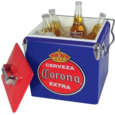 Make a statement at your next outing with the Koolatron Corona Cooler. This portable ice chest is perfect to take with on camping trips, tailgate parties, BBQs, and more. Whether you’re off on a weekend-long trip or heading to a friend’s for a sports game, this beverage cooler keeps all of your favorite snacks and drinks chilled to perfection.Built with a large 14-quart capacity, this ice chest holds up to 18 standard 12-ounce cans or 12 bottles so the whole family can bring along their favorite drinks. Equipped with a built-in bottle opener, this innovative personal cooler conveniently undoes any refreshment top that requires an opener. Crafted with a high-quality stainless steel exterior and insulated plastic interior, this retro beverage cooler keeps all of your contents cold for a whole day. Trap cold air inside the chest using the self-locking handle to improve cooling performance. No matter where you are, be the life of the party and carry your drinks in style with this Retro Corona Portable Ice Chest Hard Cooler with Bottle Opener from Koolatron.