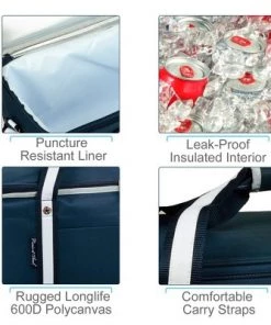 Collapsible 32 can capacity cooler on wheels with insulated, waterproof Thermal Shield cooler compartment. Telescopic steel handle (expands up to 40″) with durable wheels. Great for tailgating and picnicking. Hook and loop straps enable cooler to fold to 4″ flat overall, 2″ at the center for very compact storage. Has a convenient front pocket. Measures: 12″ Wide x 10.75′ D x 17″ H. Weighs 3.8 pounds. Great for picnics – concerts – parks – beach – tailgating – boating – fishing –
