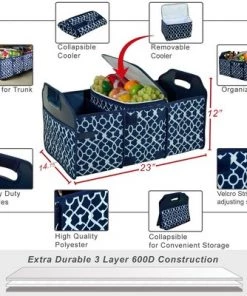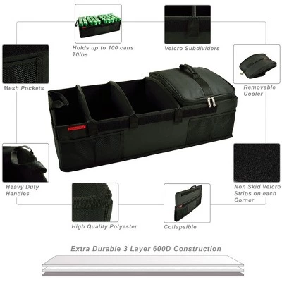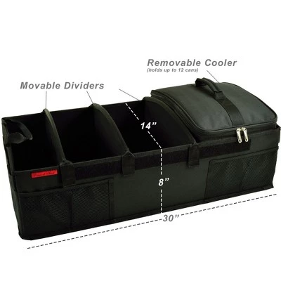 Ultimate heavy duty trunk organizer for cars, SUV’s and mini vans. Holds up to 100 cans /70 lbs. carrying capacity. Constructed with extra durable 3 layer 600d high quality polyester – reinforced with a water proof backing and heavy duty handles. Includes a heavily insulated removable cooler (holds up to 12 cans, using a 2:1 ratio of ice to cans -24 can without ice) with a heat sealed, leak-proof, puncture resistant food safe lining-keeps drinks cold for up to 12 hours (cooler dimensions are 14.5″ x 10″ x 10.5″). It includes three Infinitely adjustable Velcro sub-dividers that can be attached anywhere within the organizer to accommodate all shapes and sizes – bottles, sports gear, toys and tools. Durable Heavy Duty Handles and High Quality Polyester – built to last – Features unique rigid hard base and sides, non-skid Velcro strips on each corner that grip carpet, mesh pockets, folds flat for space saving storage. 30″ wide x 14″ deep x 8″ high. Superior design that combines the most desirable features of great size, durability, strength, rigidity, portability, no-slide, variable sections