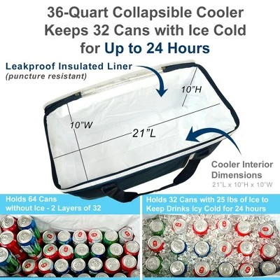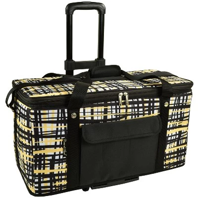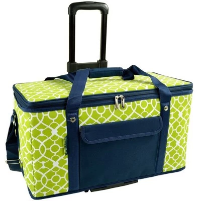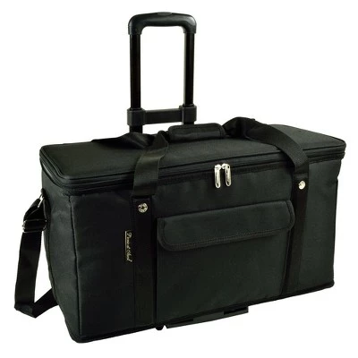 Ultimate 36 Quart Travel Cooler with Wheels. Includes (1) Cooler (1) All terrain wheeled cart – Detachable, adjustable to 40″ tall with handle fully extended. Combines best qualities of hard and Soft collapsible Coolers. Great to load up for family outings, tailgating, etc. Perfect to use as a big beach party cooler for beverages with ice. Constructed of rugged long life 600D polycanvas fabric with a sewn in wire frame and built in side supports to prevent sagging and water spills when ice melts. Features high density thermal foam insulation and a heat-sealed, leak-proof puncture resistant lining. Folds flat for compact storage to 3′ high when not in use. 50 lb. weight capacity. Internally measures 21″ long x 10″ wide x 10″ high. Comfortable carry straps, and adjustable shoulder strap. Capable of keeping drinks icy cold for up to 12 hours when fully packed with 32 cans and 25lbs of ice.(i.e. 2:1 ratio of ice to cans). Will hold 64 cans without ice (2 layers of 32). Designed by Picnic at Ascot, a California brand for 25 years – Lifetime warranty