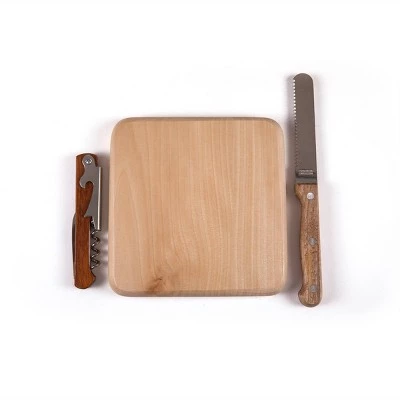 Includes: 1 Wine and Cheese Tote (10.3″ x 5.1″ x 13.3″); 1 Hardwood Cutting Board, (6″L X 6″W X 0.75″H); 1 Stainless Steel Cheese Knife with Wooden Handle (8.5″); 1 Stainless Steel Waiter-Style Corkscrew (4.75″)