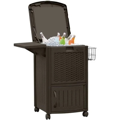 Keep beverages ice cold on your deck, patio, or porch this summer with the Suncast 77-Quart Cooler Station Patio Cooler. This essential entertaining station features a decorative design that complements any environment and comes complete with a drop leaf extension to increase your serving space. Also, a convenient hinged lid opens easily for waist-high access to drinks and treats. Plus, the cabinet space below is ideal for utensils and other supplies. This spacious cooler cart holds 77 quarts, 72 cans, or 6 2-liter bottles. Transporting this cooler is beyond easy as there are 2 locking and 2 non-locking wheels for hassle-free portability. Constructed with a durable resin construction this Cooler Station by Suncast is the perfect choice for year-round use.
